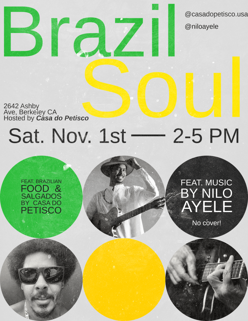 Join us on Saturday, November 1st as Nilo Ayele, a local Brazilian artist known for his Brazilian reggae and soulful Samba beats, shares his musical talent with us! There is no cover for the music, although we always encourage tips for the artist. Casa do Petisco will be serving up special Brazilian dishes in addition to the usual salgados and plates. Music: 2-5pm.
